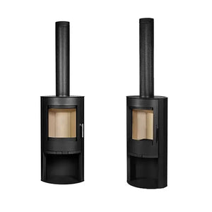 La estufa de leña Rin cuenta con un cuerpo redondo que le da un toque contemporáneo a cualquier espacio. Además, cuenta con espacio de almacenaje para leña y 6kW de potencia para calentar su hogar.